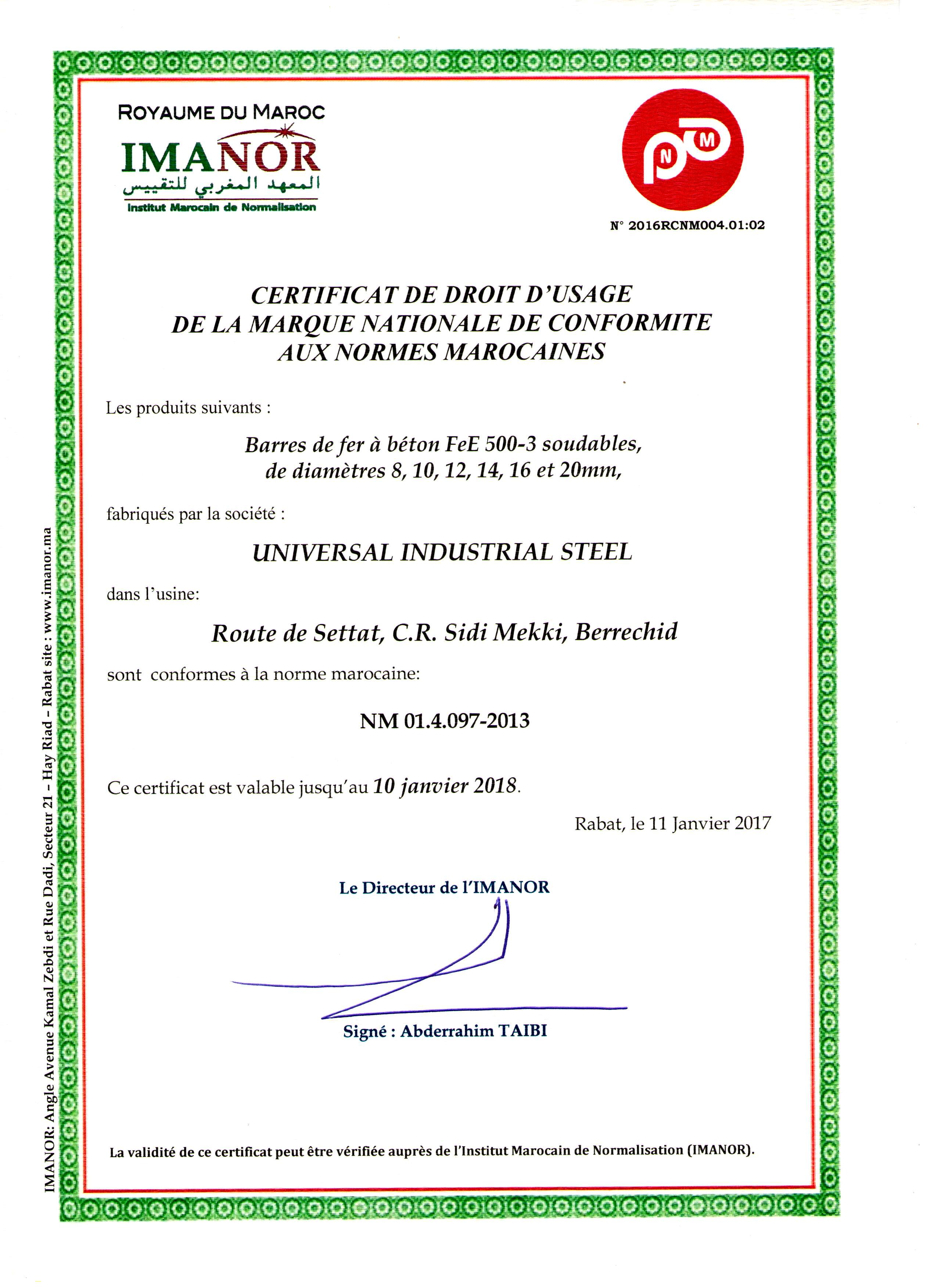 Certificat NM Post by admin 16 décembre 2016 En conformité avec la révision de la norme NM 01.4.097, UIS garantit une meilleure traçabilité de ses produits sur les chantiers à travers son marquage du rond à béton. Follow us: facebook linkedi